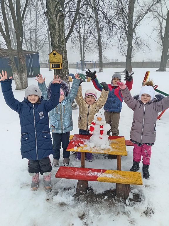 А затем на улице ребята старшей разновозрастной группы слепили снеговика и поиграли в игру "Снежки", а также покормили птичек.