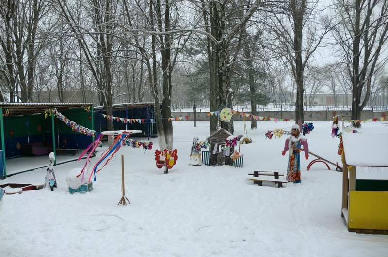 Для проведения праздника силами работников детского сада была украшена площадка флажками, чучелом масленицы, ленточной каруселью
