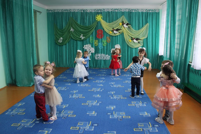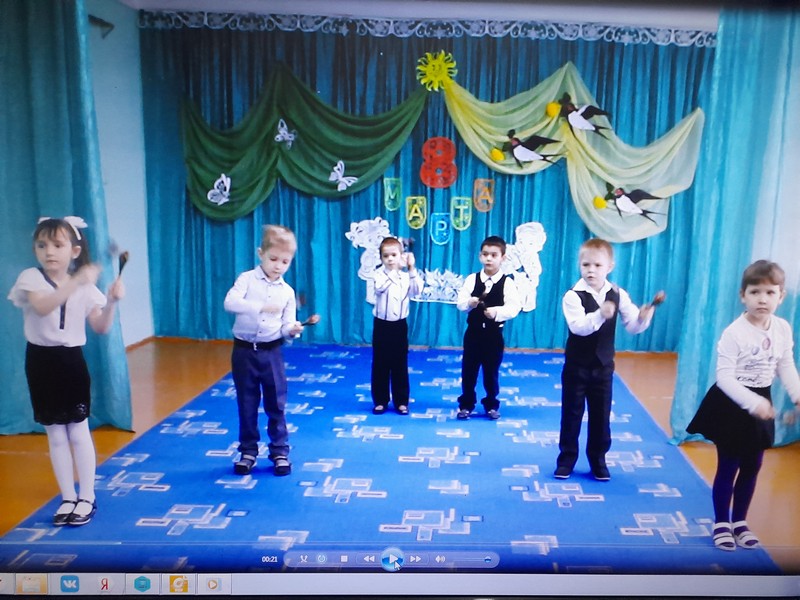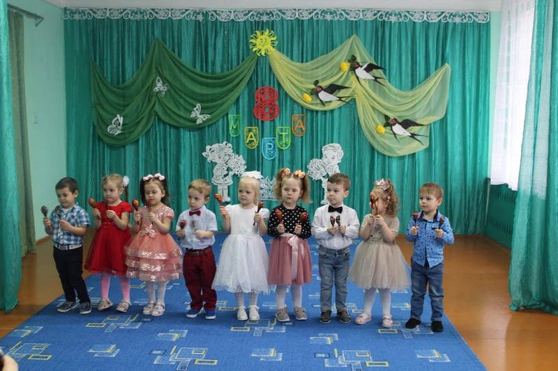 Дети младшей и старшей разновозрастных групп читали стихи, спели песню «Мамочка, родная мамочка». Малыши спели песню для бабушек «Два веселых гуся» (с деревянными ложками) и исполнили танец «Не ссориться». Дети старшей группы исполнили танец с деревянными ложками «Где же наши ложки?» для бабушек, а для мам современную композицию под мелодию «Мама-Мария».
