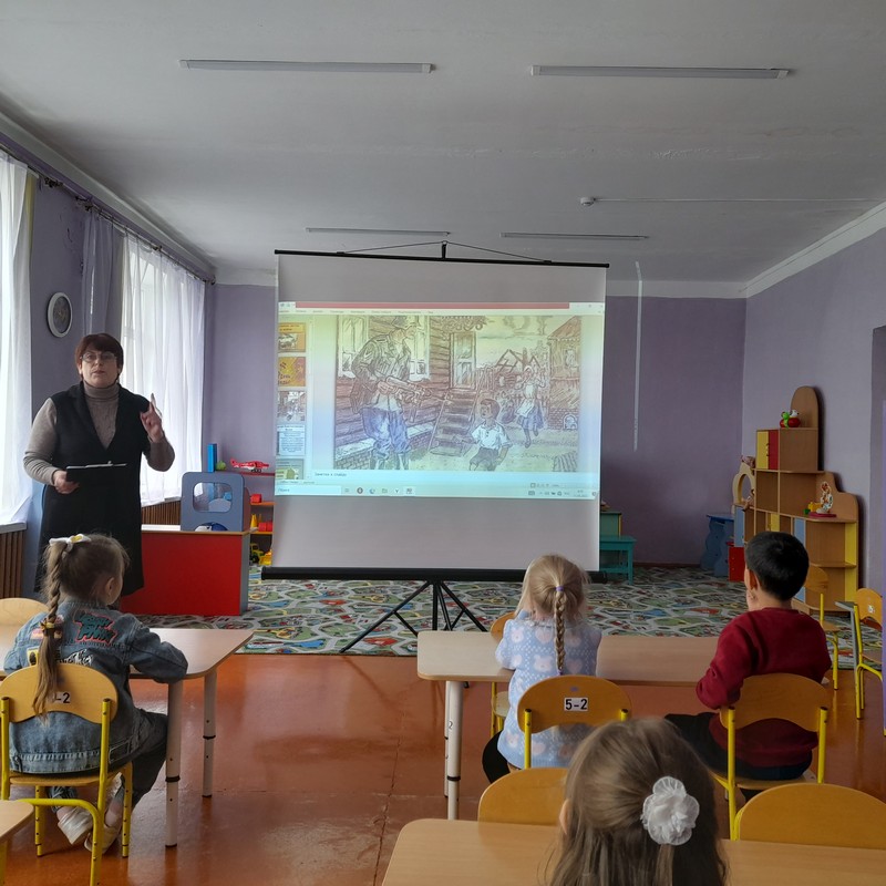 Библиотекарь Ново-Надеждинского отдела библиотеки МБУККР «Куйбышевской РМЦБ » Коломийцева Наталья Михайловна пришла в гости с презентацией «Расскажем детям о войне».